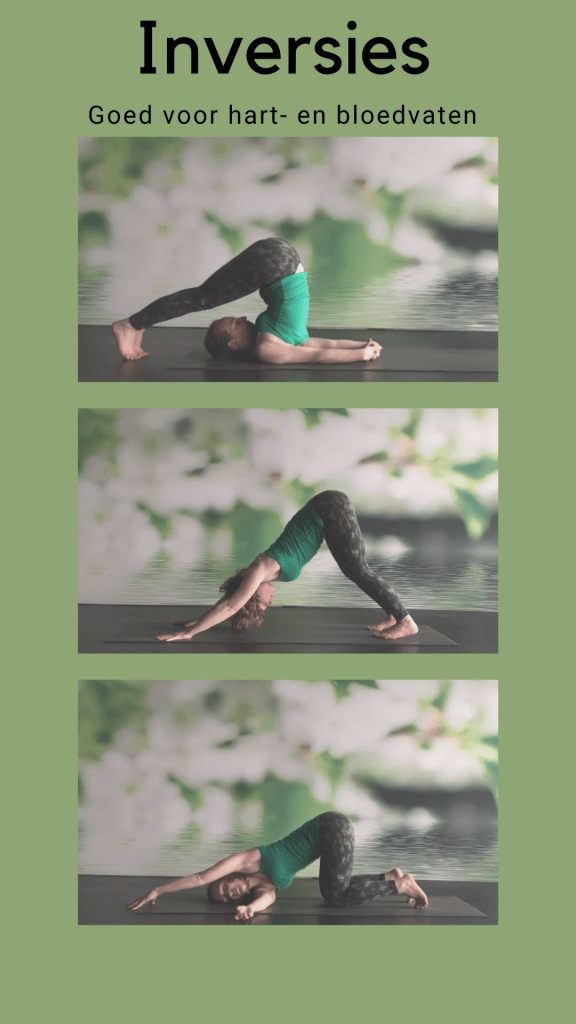 Als we rechtop staan is de bloeddruk in onze benen hoger dan de bloeddruk in ons hart. In inversies of omgekeerde houdingen wordt dit omgedraaid; de bloeddruk in ons hoofd neemt toe omdat het meer bloed naar het hoofd toe stroomt. Onze barereceptoren (regelsysteem van het lichaam om de bloeddruk in stand te houden en te reguleren) in de halsslagaders en aortaboog regeren op deze verandering door de hartslag te vertragen en de bloeddruk wat te verlagen. Dit is ook de reden waarom je soms duizelig wordt als je te snel uit een vooroverbuiging omhoog komt. Daarnaast zorgt het vertragen van de hartslag er ook voor dat het zenuwstelsel kalmeert wat maakt dat inversies ideaal zijn als je gestrest bent.